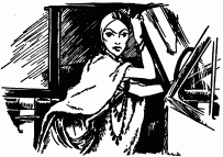 At that moment the peace was shattered by an extremely strident motor horn. A large car was coming towards them. It drew up at a big house just ahead of them, and a tall woman came out onto the front-door steps. She was wearing a tight-fitting emerald satin dress, several ropes of rubies, and an absolutely simple white mink cloak, which reached to the high heels of her ruby-red shoes. She had a dark skin, black eyes with a tinge of red in them, and a very pointed nose. Her hair was parted severely down the middle and one half of it was black and the other white—rather unusual.