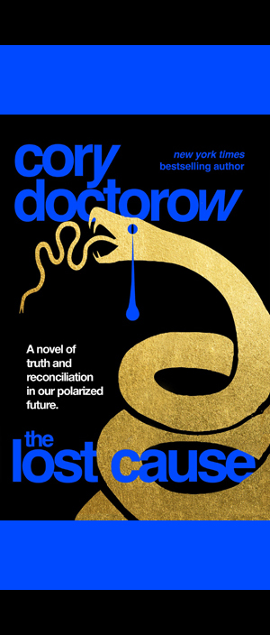 In Cory Doctorow’s near-future novel The Lost Cause, a climate-ravaged California becomes the battleground for a new generation’s fight to rebuild society from the ashes of disaster and entrenched power. As protagonist Brooks Palazzo navigates wildfires, waves of climate refugees, and the legacy of his MAGA grandfather, he’s swept up in a struggle where youthful idealism clashes with authoritarian backlash from reactionary forces and plutocrats desperate to preserve their privilege. |