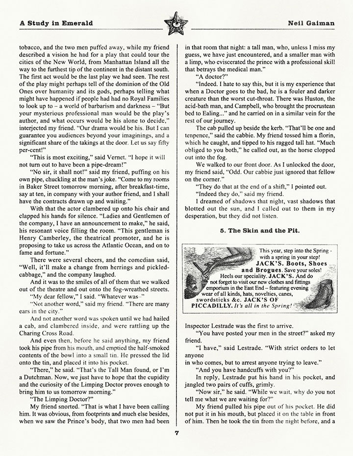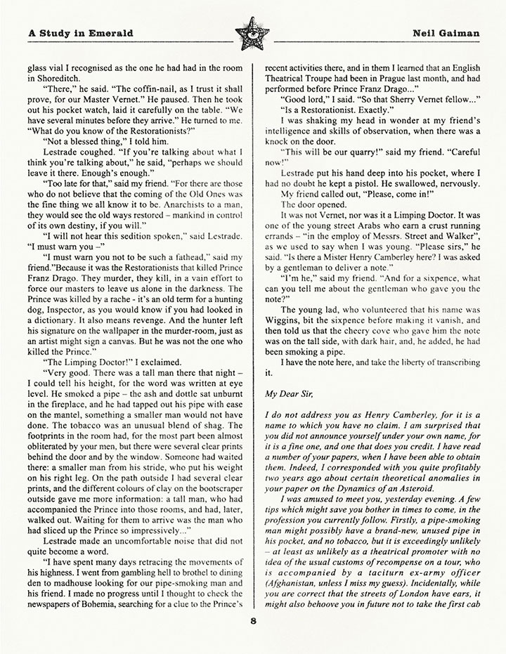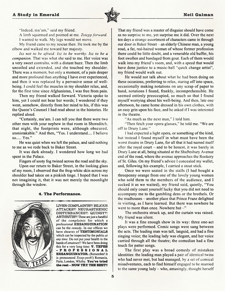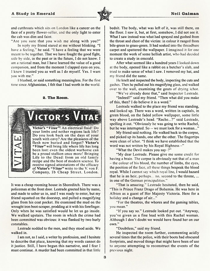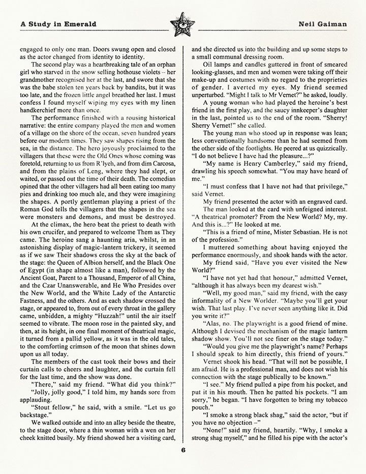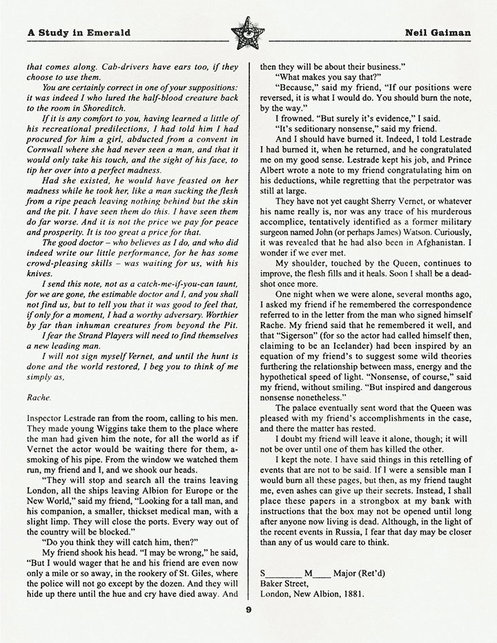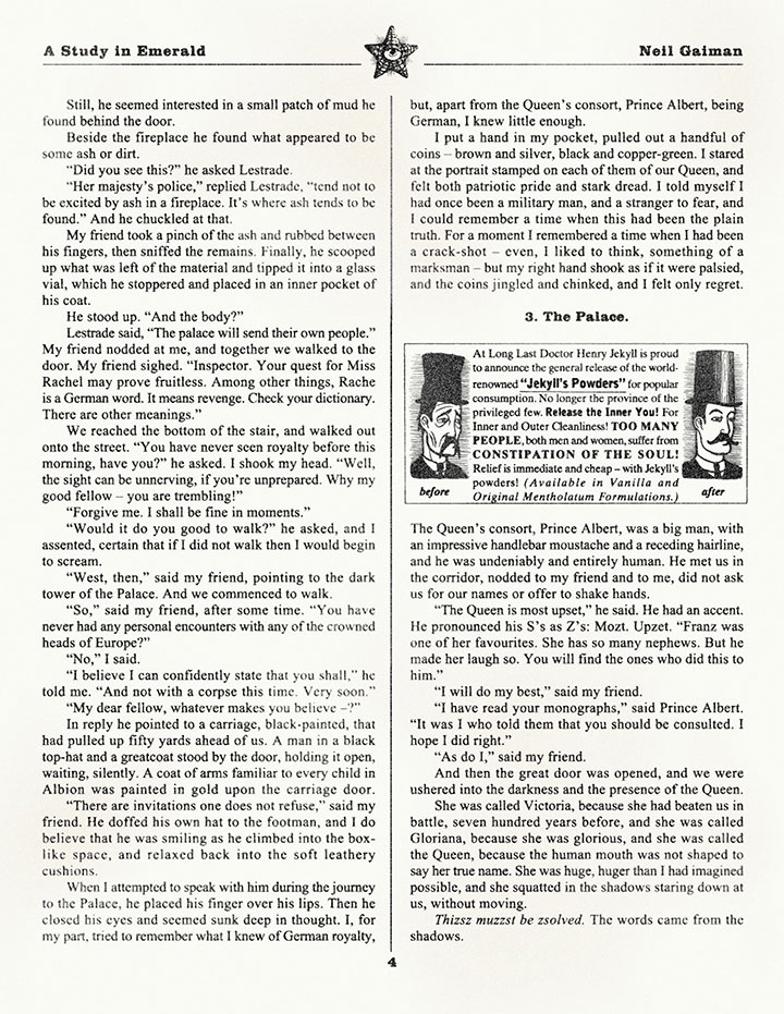 A Study In Emerald by Neil Gaiman "A Study in Emerald" is a short alternate-reality Sherlock Holmes story, seemingly printed in the newspaper 'The Star of Albion', on Sunday, June 28, 1914. The author and narrator, Neil Gaiman, reads almost everything on a page, including the advertisements. |