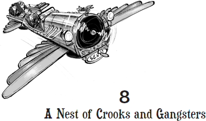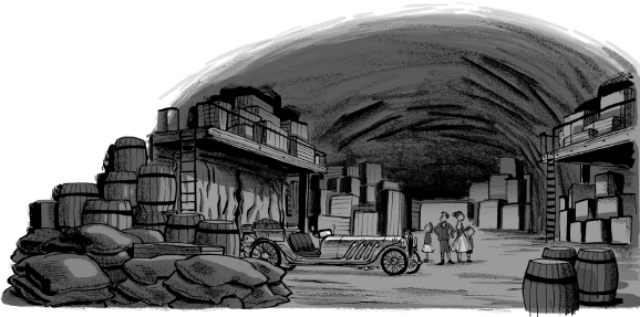 While the others piled out and began carefully sniffing about round the edge of the bales and barrels and packages, Commander Pott went back and found the switch on their side of the secret door, and with a grind and a hum of machinery, the two halves came together again. Then he came back and they all systematically began to pry and peer into the secret stocks that were piled up round the walls of the big, echoing vault.