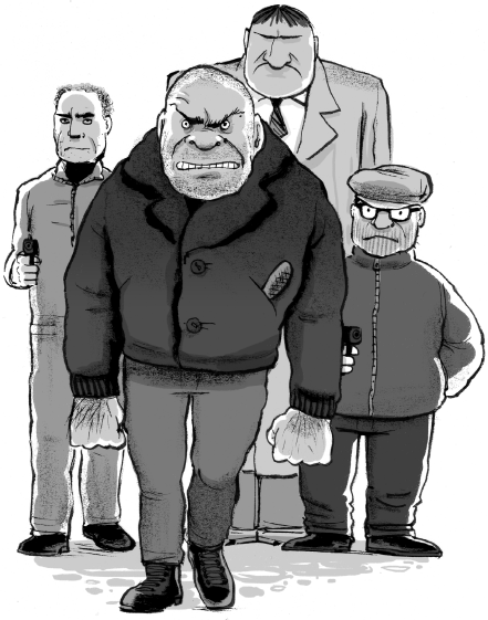 Commander Pott whispered, “I regret to have to announce that that’s Joe the Monster. I’ve seen pictures of him outside police stations. And the other three are his gang — Man-Mountain Fink, who’s escaped from heaven knows how many prisons — he must be on the run now; Soapy Sam — he’s their explosives expert for opening safes (‘soap’ is the crooks’ name for gelignite), and Blood-Money Banks, the blackmailer. Watch out! This is going to be tricky!”
