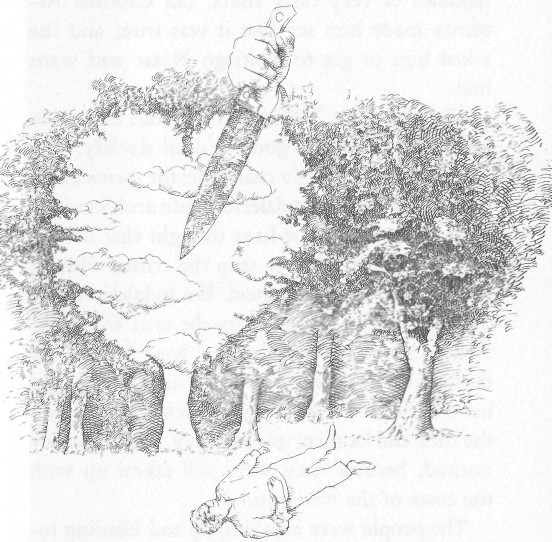 The knife went through the palm of his right hand and then sank into his side up to the hilt. Everybody heard his cry of pain.