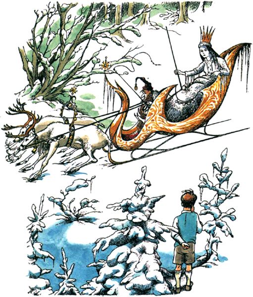 “Just like a girl,” said Edmund to himself, “sulking somewhere, and won’t accept an apology.” He looked round him again and decided he did not much like this place, and had almost made up his mind to go home, when he heard, very far off in the wood, a sound of bells. He listened and the sound came nearer and nearer and at last there swept into sight a sledge drawn by two reindeer.