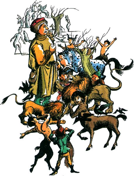 Of course the children’s eyes turned to follow the lion; but the sight they saw was so wonderful that they soon forgot about him. Everywhere the statues were coming to life. The courtyard looked no longer like a museum; it looked more like a zoo. Creatures were running after Aslan and dancing round him till he was almost hidden in the crowd. Instead of all that deadly white the courtyard was now a blaze of colors; glossy chestnut sides of centaurs, indigo horns of unicorns, dazzling plumage of birds, reddy-brown of foxes, dogs and satyrs, yellow stockings and crimson hoods of dwarfs; and the birch-girls in silver, and the beech-girls in fresh, transparent green, and the larch-girls in green so bright that it was almost yellow. And instead of the deadly silence the whole place rang with the sound of happy roarings, brayings, yelpings, barkings, squealings, cooings, neighings, stampings, shouts, hurrahs, songs and laughter.