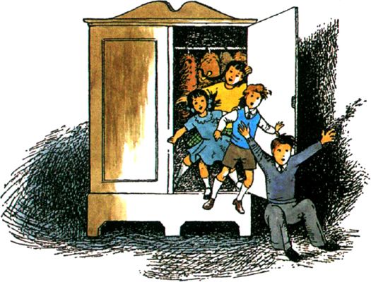 So these Kings and Queens entered the thicket, and before they had gone a score of paces they all remembered that the thing they had seen was called a lamp-post, and before they had gone twenty more they noticed that they were making their way not through branches but through coats. And next moment they all came tumbling out of a wardrobe door into the empty room, and they were no longer Kings and Queens in their hunting array but just Peter, Susan, Edmund and Lucy in their old clothes. It was the same day and the same hour of the day on which they had all gone into the wardrobe to hide. Mrs. Macready and the visitors were still talking in the passage; but luckily they never came into the empty room and so the children weren’t caught.