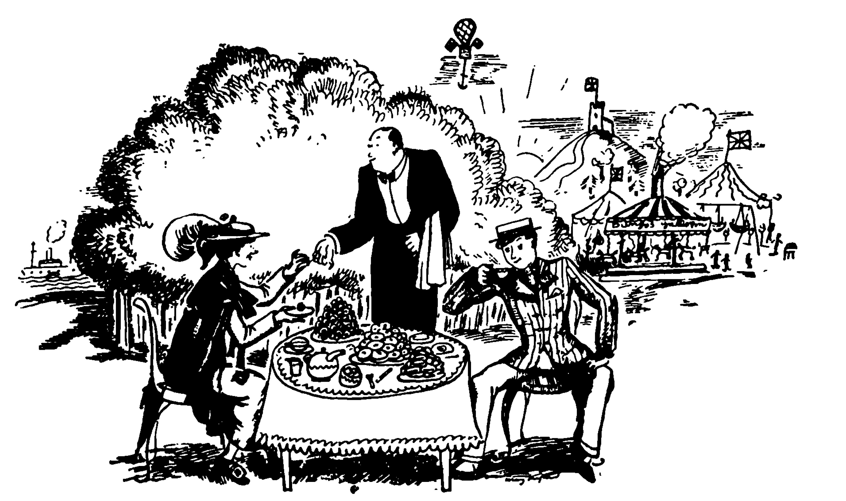 "There is Nothing to Pay," said the Waiter, before they had time to ask for the bill. "It is a Pleasure. You will find the Merry-go-Round just over there!" And he waved his hand to a little gap in the trees, where Mary Poppins and the Match-Man could see several wooden horses whirling round on a stand.