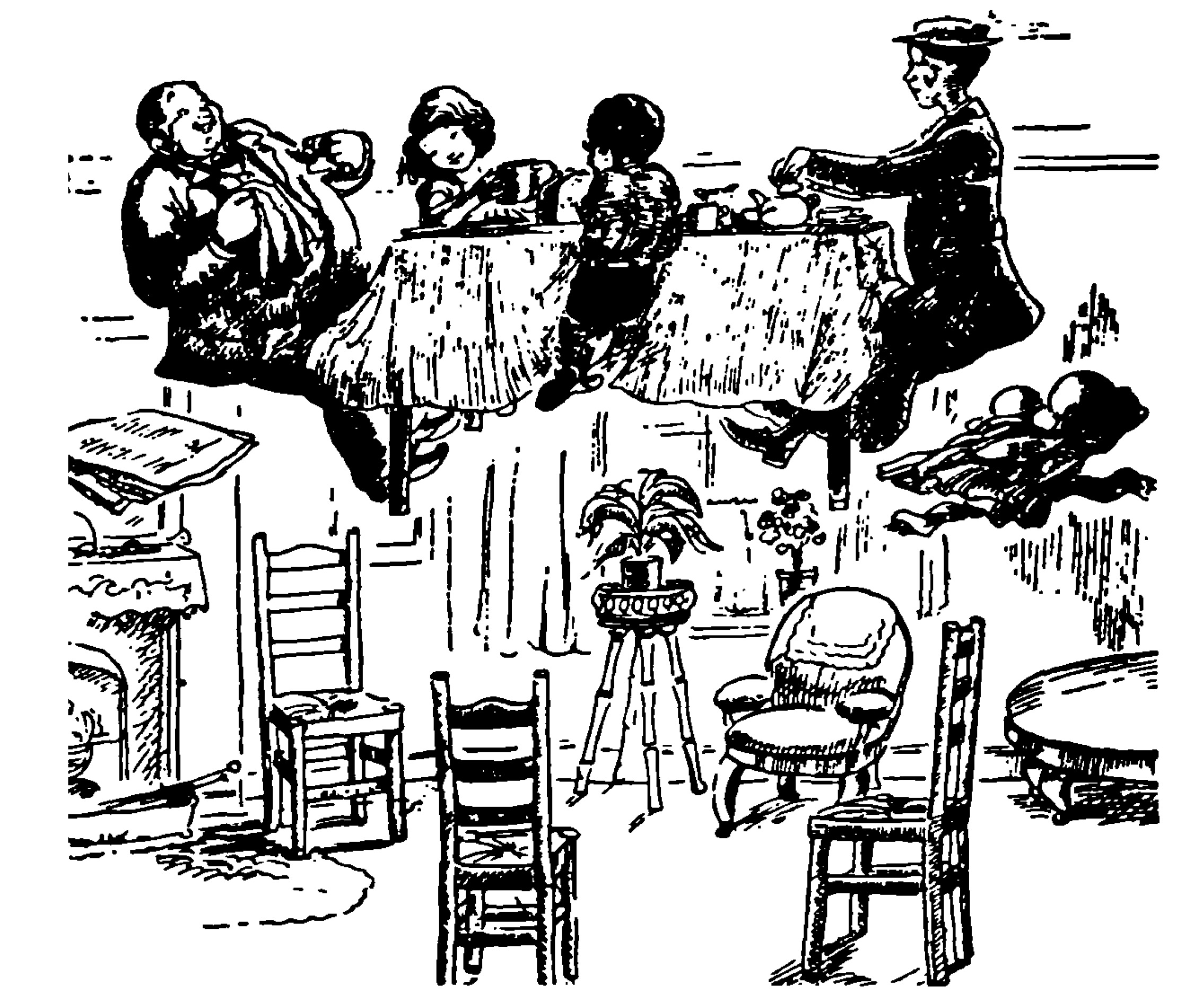 "It's no good," he said, blowing his nose. "I give it up. And my young friends here seem to be no better at sadness than I am. Mary, can't you do something? We want our tea."