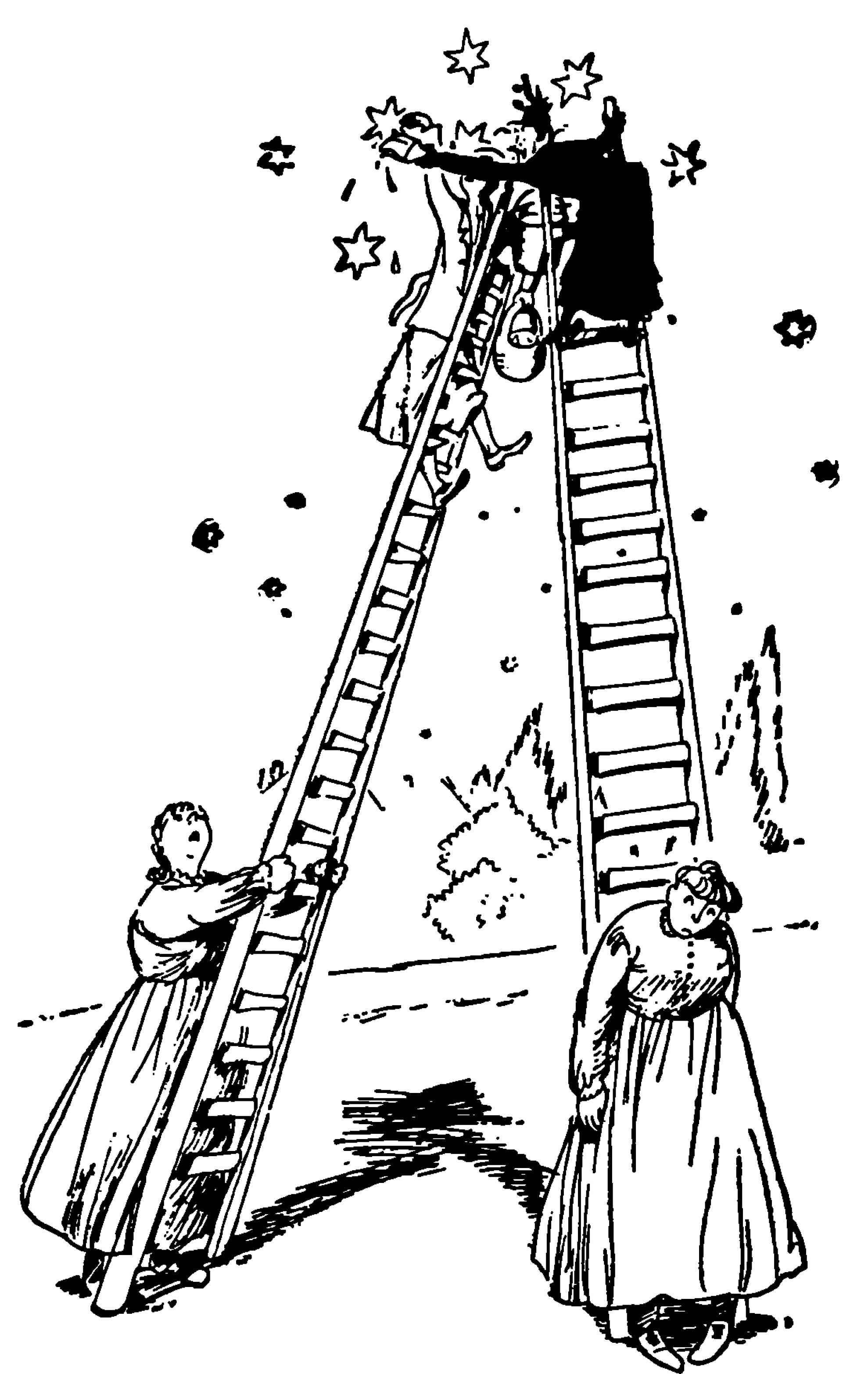 As soon as Miss Fannie and Miss Annie had so fixed the ladders that they seemed to be standing with one end on the earth and the other leaning on the sky, Mrs. Corry picked up her skirts and the paint-brush in one hand and the pail of glue in the other. Then she set her foot on the lowest rung of one of the ladders and began to climb it. Mary Poppins, carrying her basket, climbed the other.
