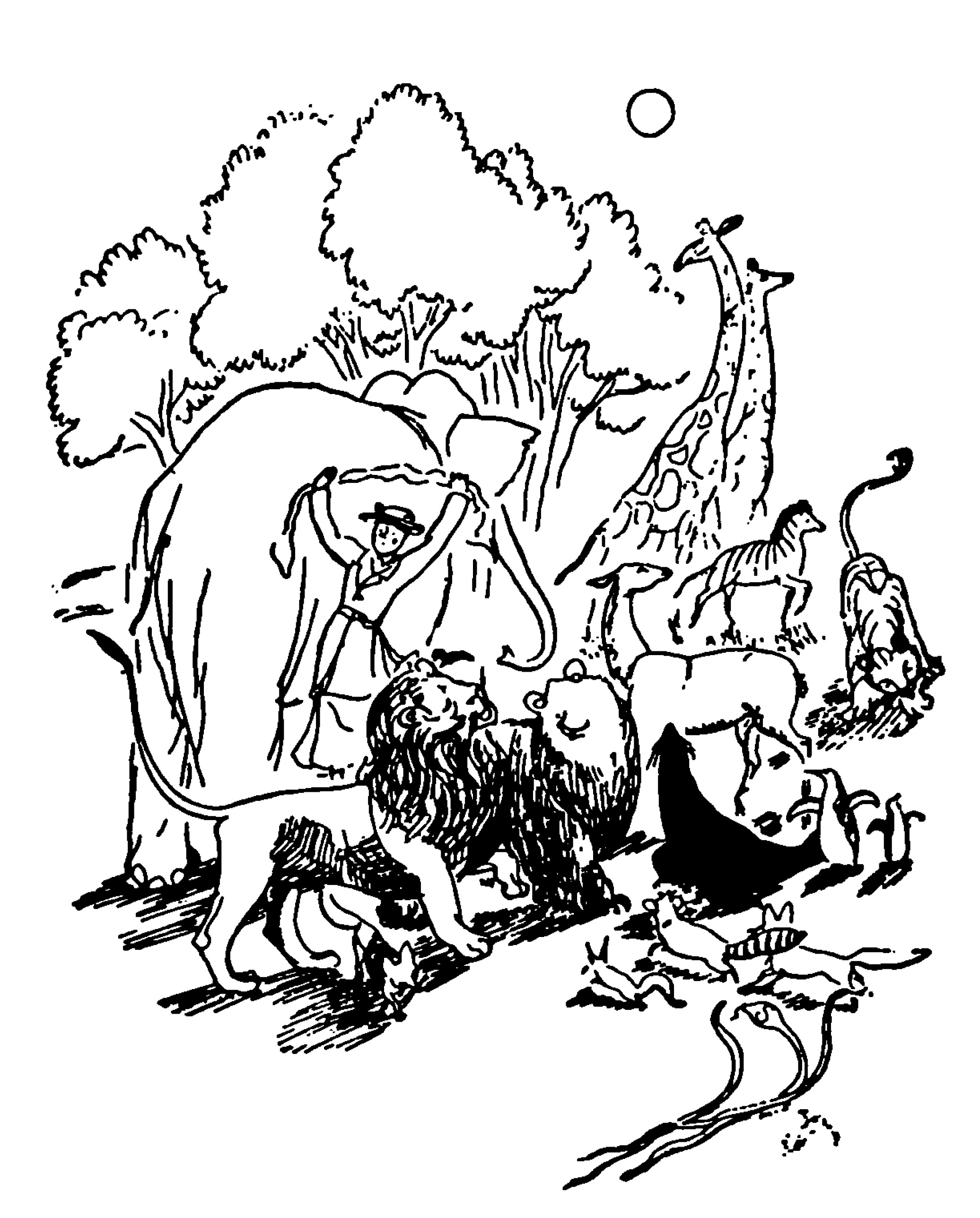 Children of all shapes and sizes, from babies in long clothes upwards, were scrambling about in another cage. The animals outside regarded these with great interest and some of them tried to make the babies laugh by thrusting their paws or their tails in through the bars. A giraffe stretched his long neck out over the heads of the other animals and let a little boy in a sailor-suit tickle its nose.