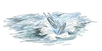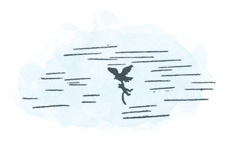 “Goodness me,” the little bird cried, “I didn’t know you had skates hidden in your shirt. Toss those heavy skates away quickly or we will both come down in the ocean and perish.” Stuart threw his skates away and watched them fall down, down, till they disappeared in the gray waves below. “That’s better,” said Margalo. “Now we’re all right. I can already see the towers and chimneys of New York.”