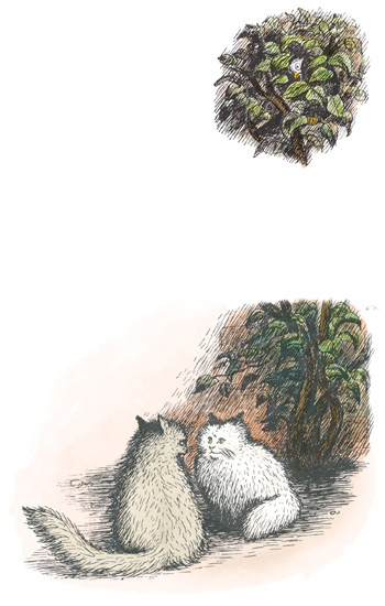 The cats’ voices grew louder, and they talked so loudly that they never heard a slight rustling in the vine a few feet above their heads. It was a gray pigeon, who had been asleep there and who had awakened at the sound of cats and begun to listen. “This sounds like an interesting conversation,” said the pigeon to himself. “Maybe I’d better stay around and see if I can learn something.”