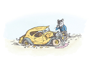 “Hey, watch out!” yelled Dr. Carey. “You pushed the starter button. She’s off! There she goes! She’s away! She’s loose in the room—now we’ll never catch her.” He grabbed Stuart up and placed him on a table where he wouldn’t be hit by a runaway car.