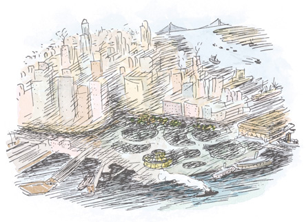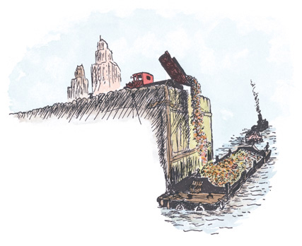 When the truck arrived at the East River, which borders New York City on the east and which is a rather dirty but useful river, the driver drove out onto the pier, backed up to a garbage scow, and dumped his load. Stuart went crashing and slithering along with everything else and hit his head so hard he fainted and lay quite still, as though dead. He lay that way for almost an hour, and when he recovered his senses he looked about him and saw nothing but water. The scow was being towed out to sea.