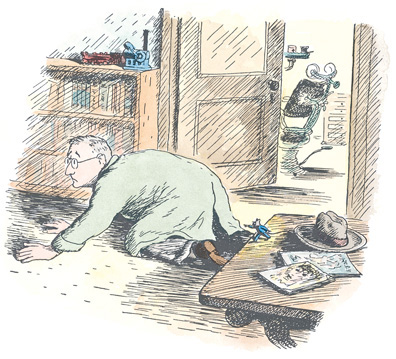 “Oh, mercy! Oh, mercy!” Stuart cried when he realized what he had done. It was a very awkward situation. Neither Dr. Carey nor Stuart could see the little automobile, yet it was rushing all over the room under its own power, bumping into things. First there came a crashing noise over by the fireplace. The hearth broom fell down. Dr. Carey leapt for the spot and pounced on the place where the sound had come from. But though he was quick, he had hardly got his hands on the place when there was another crash over by the wastebasket. The Doctor pounced again. Pounce! Crash! Pounce! Crash! The Doctor was racing all over the room, pouncing and missing. It is almost impossible to catch a speedy invisible model automobile even when one is a skillful dentist.