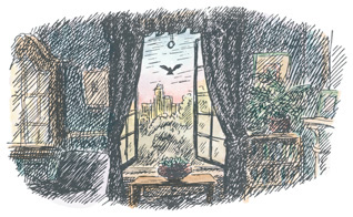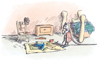 Fifteen minutes later, in they flew through the open window of the Littles’ living room and landed on the Boston fern. Mrs. Little, who had left the window up when she missed Margalo, was glad to see them back, for she was beginning to worry. When she heard what had happened and how near she had come to losing her son, she took Stuart in her hand, even though his clothes smelled nasty, and kissed him. Then she sent him upstairs to take a bath, and sent George out to take Stuart’s clothes to the cleaner.
