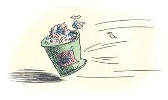 “If I jump now I’ll kill myself,” thought Stuart. So he ducked back into the can and waited. The men threw the can with a loud bump into the truck, where another man grabbed it, turned it upside down, and shook everything out. Stuart landed on his head, buried two feet deep in wet slippery garbage. All around him was garbage, smelling strong. Under him, over him, on all four sides of him—garbage. Just an enormous world of garbage and trash and smell. It was a messy spot to be in. He had egg on his trousers, butter on his cap, gravy on his shirt, orange pulp in his ear, and banana peel wrapped around his waist.