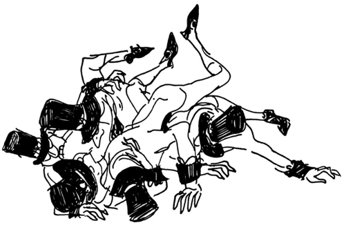 Milo noticed many of the people he had seen in the market place. The letter man was busy explaining to an interested group the history of the W, and off in a corner the Humbug and the Spelling Bee were arguing fiercely about nothing at all. Officer Shrift wandered through the crowd, suspiciously muttering, “Guilty, guilty, they’re all guilty,” and, on noticing Milo, brightened visibly and commented in passing, “Is it six million years already? My, how time flies.”